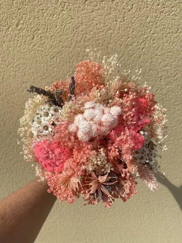 Bouquet rond avec roses blanches, fleurs violettes et blanches, et feuillage vert, créant un mélange élégant de couleurs et de textures.